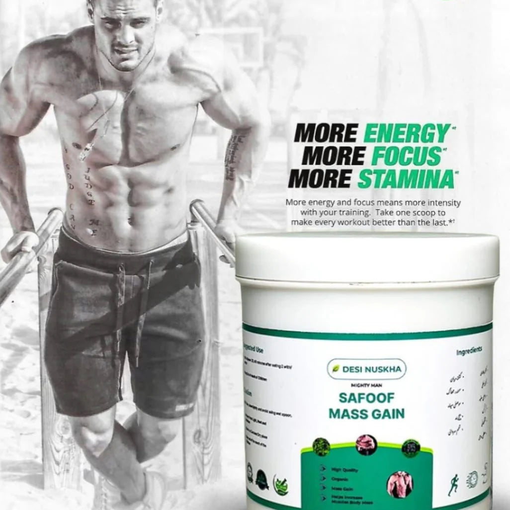 Unlock your body's natural potential with Safoof Mass Gain, a powerful herbal blend crafted to support healthy weight gain and overall vitality. Made from 100% natural ingredients sourced from trusted herbal farms, this unique formula is designed to improve digestion, enhance nutrient absorption, and boost metabolism - helping you achieve a balanced and healthy physique naturally. Each serving of Safoof Mass Gain is enriched with a synergistic mix of Kalwanji, Ajwain, Mint, Saunf, Ginger, Green Tea Extracts, and Carom Seeds, carefully selected for their time-tested benefits in traditional wellness. These potent herbs work together to strengthen appetite, improve gut health, and provide sustained energy throughout the day. •Kalwanji (Black Seeds):Supports metabolism and immunity. 。Ajwain & Carom Seeds: Promote healthy digestion and appetite. • Mint & Saunf (Fennel): Soothe the stomach and aid nutrient absorption. • Ginger: Enhances metabolism and energy levels. Green Tea Extracts: Rich in antioxidants to support overall wellness. Free from chemicals, preservatives, and arti..c additives, Safoof Mass Gain is safe for daily use and suitable for both men and women. Whether you're looking to build muscle, regain healthy weight, or simply feel more energized, this herbal formula is your natural partner on the journey to better health and vitality. Experience the power of nature. Gain strength, energy, and confidence -the herbal way with Safoof Mass Gain.